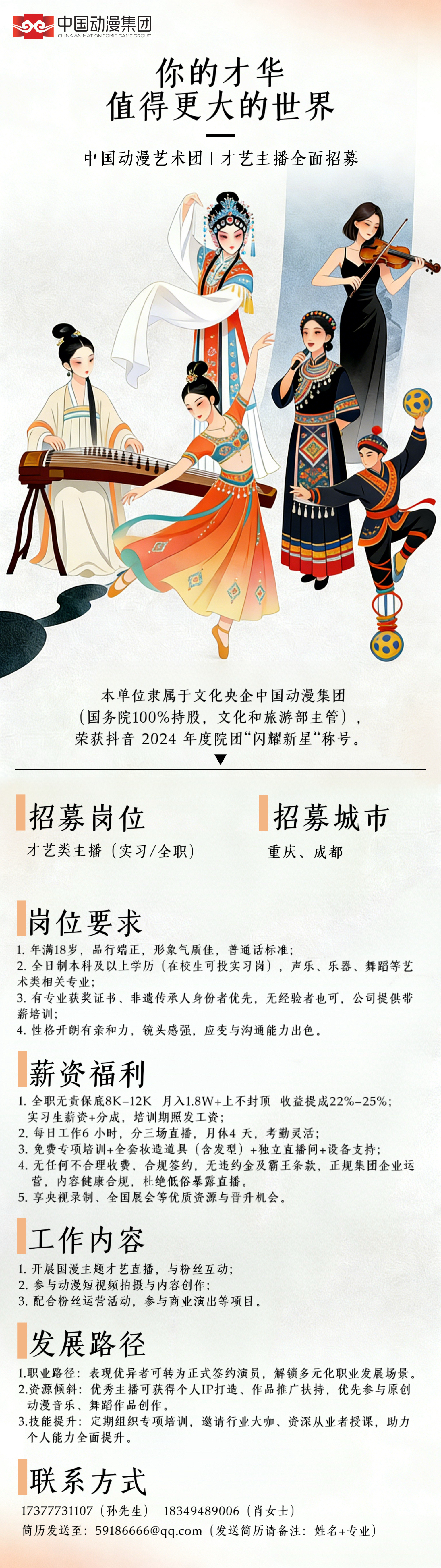 2.全日制本科及以上学历(在校生可投实习岗),声乐、乐器、舞蹈等艺术类相关专业;