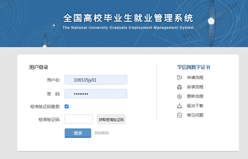 (1)登录“全国高校毕业生就业管理系统”https://login.chsi.com.cn/passport/login?service=https%3A%2F%2Fjy.ncss.cn%2Fcaslogin.html