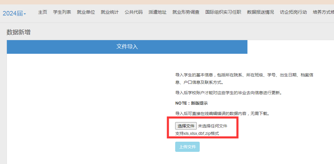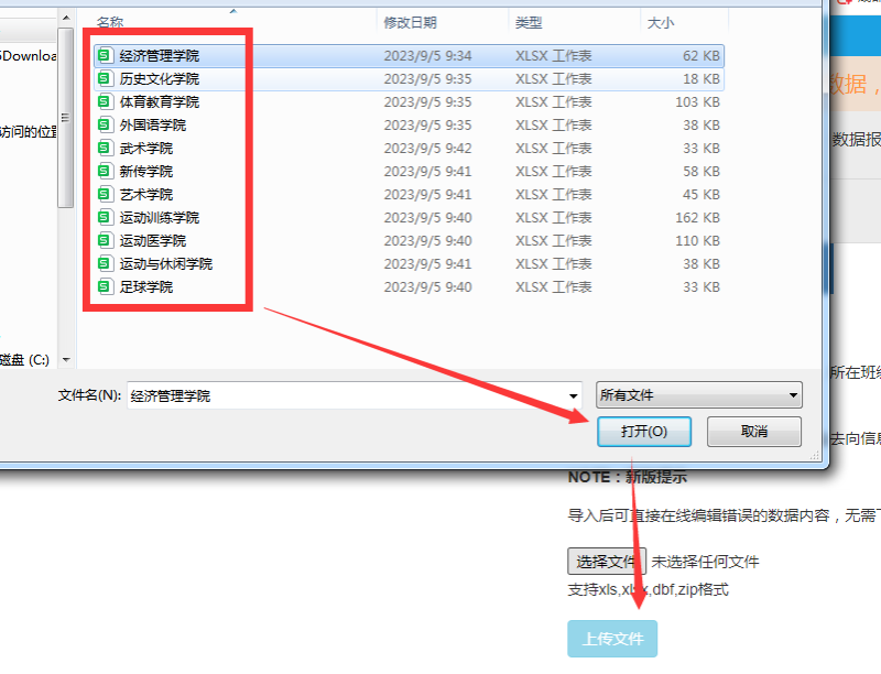 (3)点击“选择文件”后,选择已经完整填写基本信息和相关代码的excel表,点击“打开”后,选择“上传文件”。