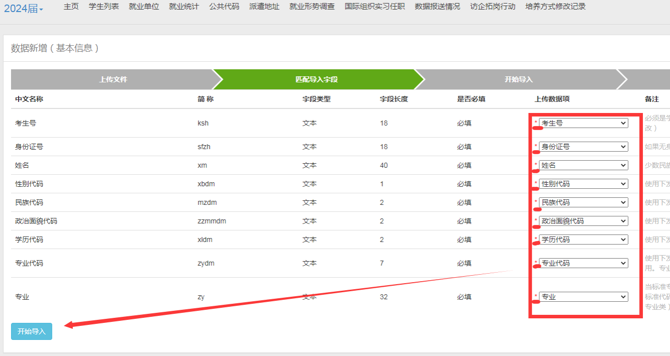 (4)匹配导入字段,确保带*号的均匹配,无标红后,点击“开始导入”。