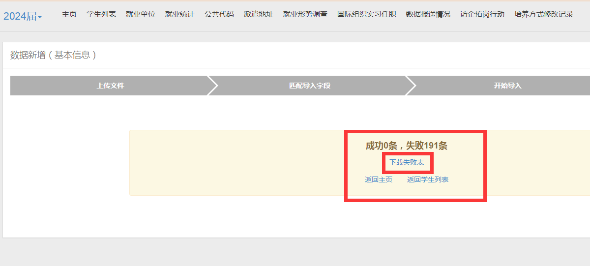(5)查看是否成功,如全部导入成功,则完成生源数据上报。若显示失败,请点击“下载失败表”,按照表中中最后一列提示,进行更正。