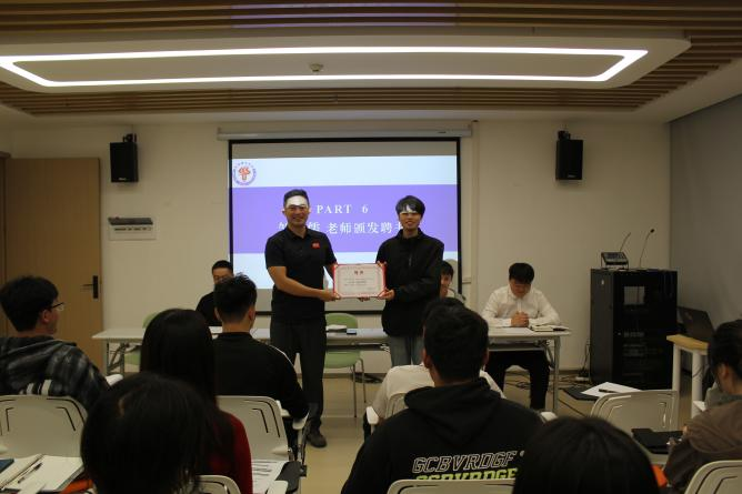 随后进入经验交流环节,往届学生干部胡旭分享了工作心得,鼓励新成员在工作中踏实进取、共同成长。后由邹佩儒老师为其颁发聘书,这不仅是对他过往工作的认可,更是对新成员的激励。