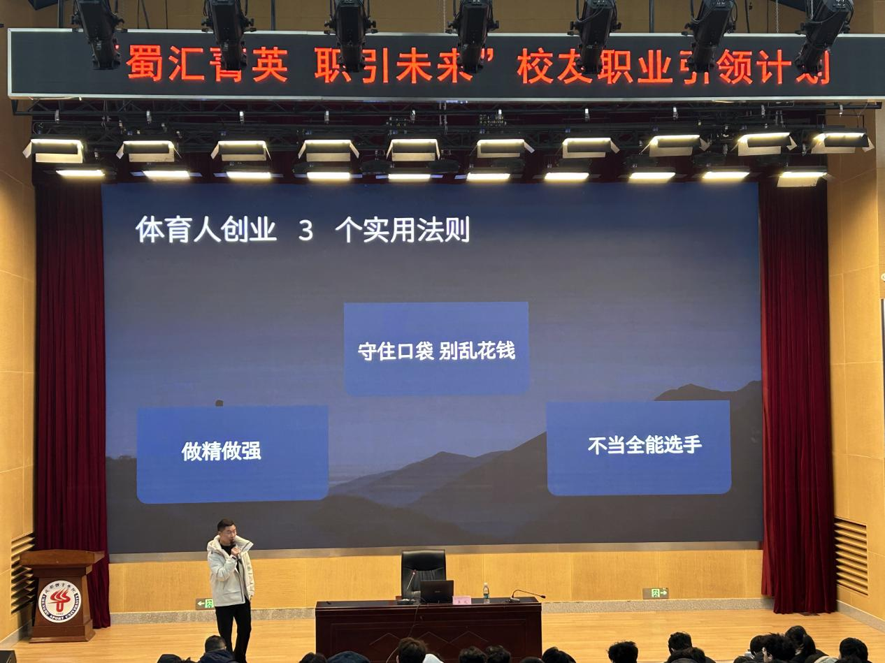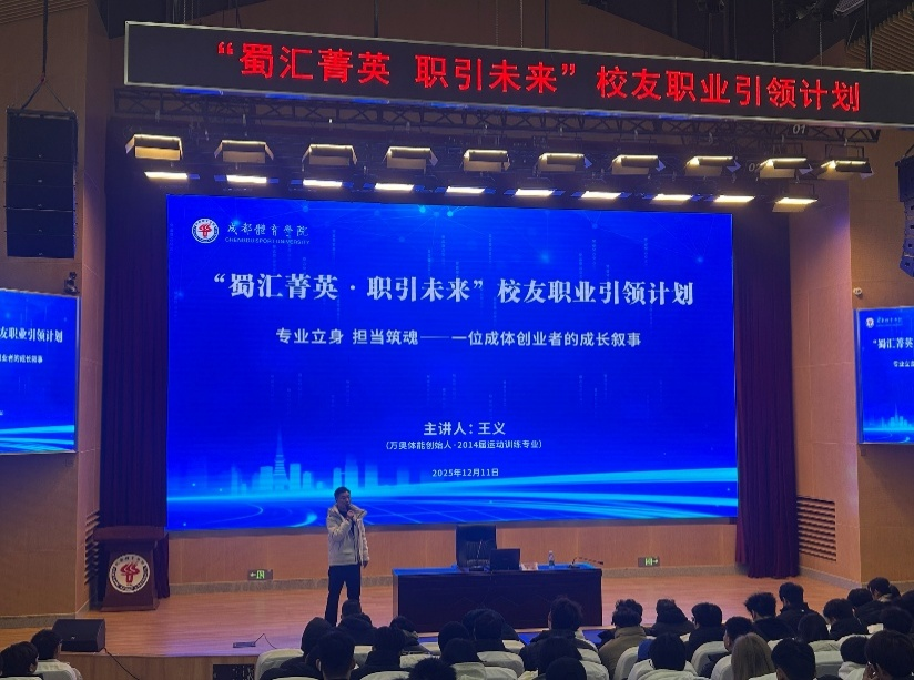为凝聚校友资源,激发学子就业创业热情,搭建校企协同育人桥梁,2025年12月11日上午,成都体育学院校友就业创业经验分享会在行健楼2楼同传室顺利举行。2014届运动训练专业校友万奥体能运动中心创始人王义受邀担任主讲人,为现场百余名师生带来了一场兼具实操价值与思想深度的经验分享。